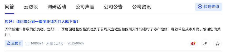与此同时,在深交所互动易平台上,近日有投资者再次质问公司一季度业绩为何大幅下滑。天华新能董秘回应称,系一季度因锂盐价格波动及子公司天宜锂业和四川天华均进行了停产检修,导致单位成本升高。