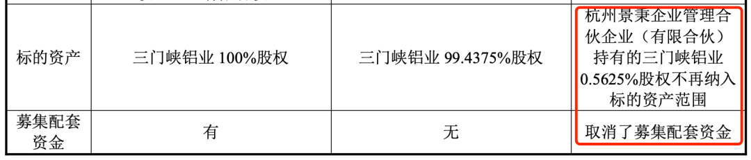 8月22日晚间,焦作万方发布了此次交易的草案,跟预案相比有一些差别:一是从购买三门峡铝业100%股权变更为购买99.4375%股权;二是取消了募集配套资金;三是由于分红派息等原因,本次发行股份购买资产的发行价格由5.52元/股调整为5.39元/股。