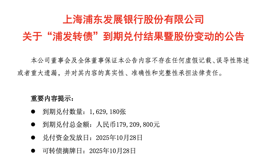 公告显示,截至2025年10月27日,累计已有498.37亿元浦发转债转为公司普通股,占浦发转债转股前公司已发行普通股股份总额的13.4701%。