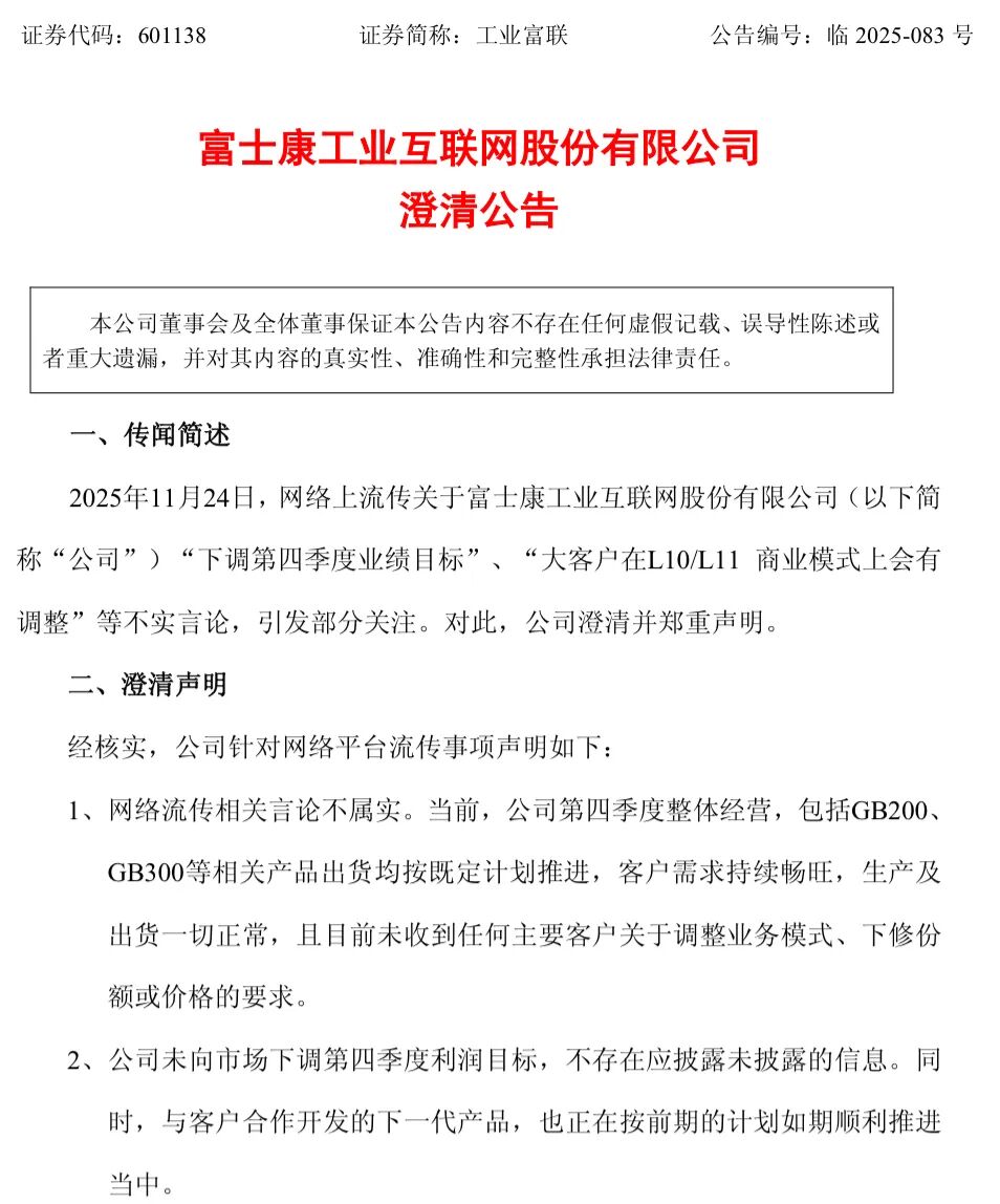 11月24日晚间,工业富联发布澄清公告称,24日网络上流传关于工业富联“下调第四季度业绩目标”“大客户在L10/L11商业模式上会有调整”等不实言论,引发部分关注。